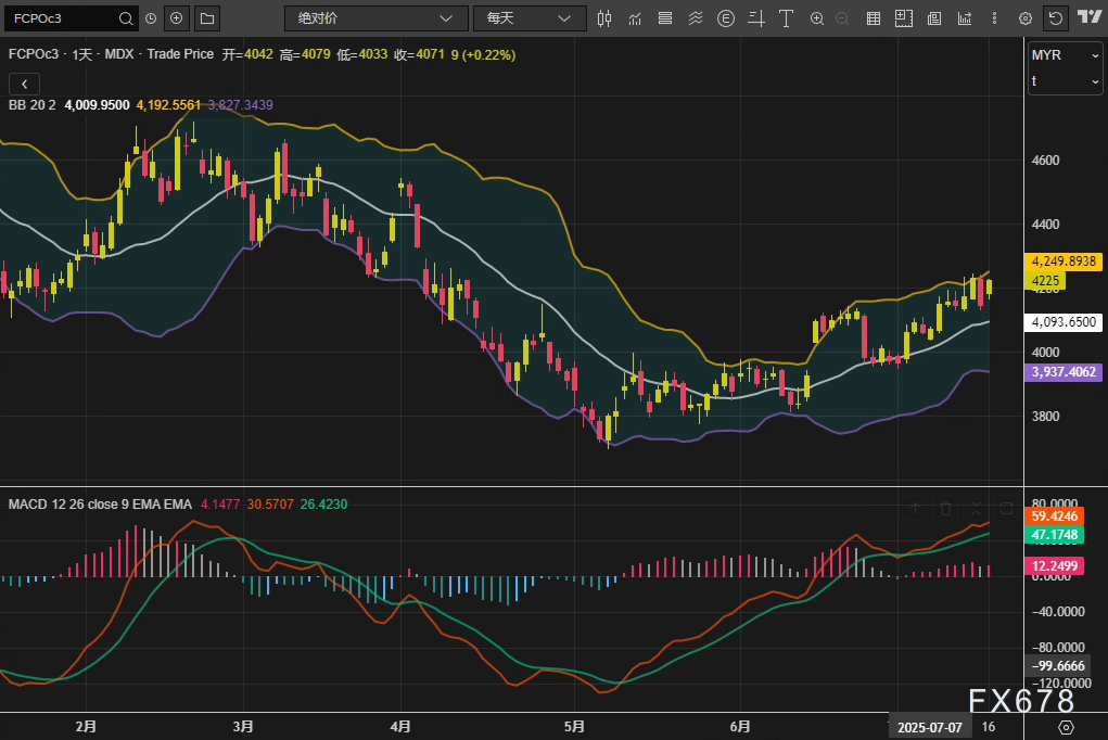 exness外汇官网——马来西亚衍生品交易所(BMD)棕榈油主力合约FCPOc3周三(7月16日)收涨1.49%,报4,225林吉特/吨,成功收复前一交易日失地。日线级别技术指标显示,布林通道中轨位于4,009林吉特,MACD柱状线收窄至4.15,暗示短期动能有所修复。此次反弹主要受到芝加哥豆油及欧洲菜籽油价格联动提振,而林吉特汇率微贬0.02%进一步增强了出口报价竞争力。