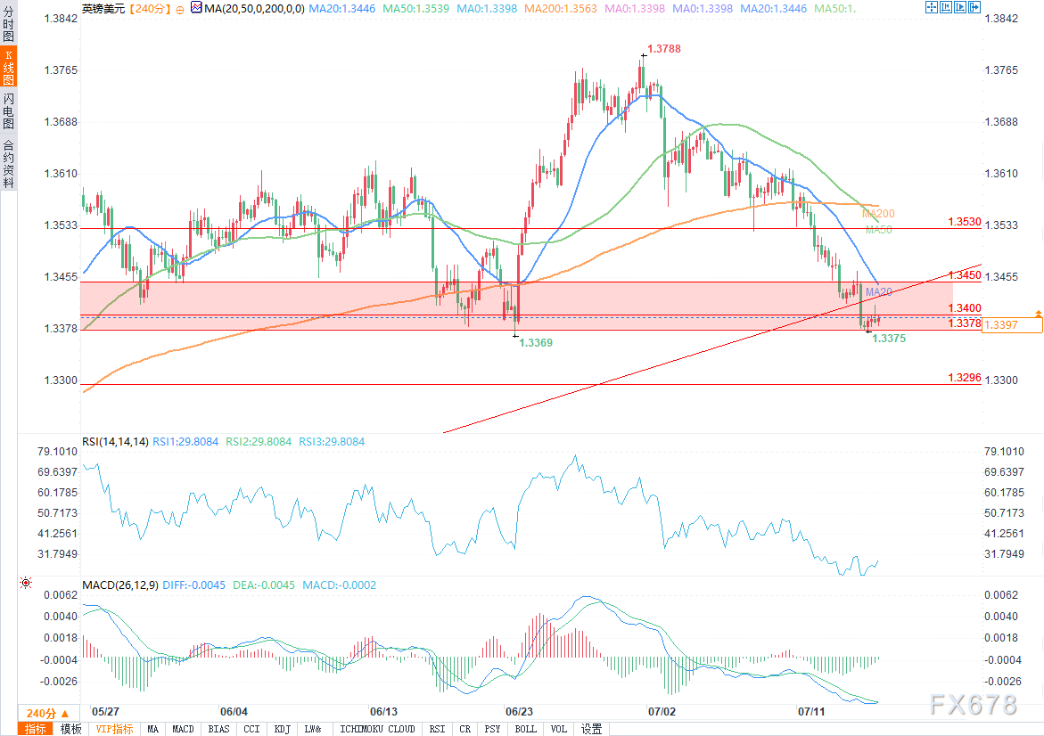 英镑/美元短期走势取决于7月17日就业数据。若数据疲软,汇价可能跌向1.3296,交易者可考虑在1.3415附近逢高做空,止损设在1.3460,目标1.3296。若数据超预期,汇价或反弹至1.3530,可在1.3370附近逢低买入,止损1.3340,目标1.3460。