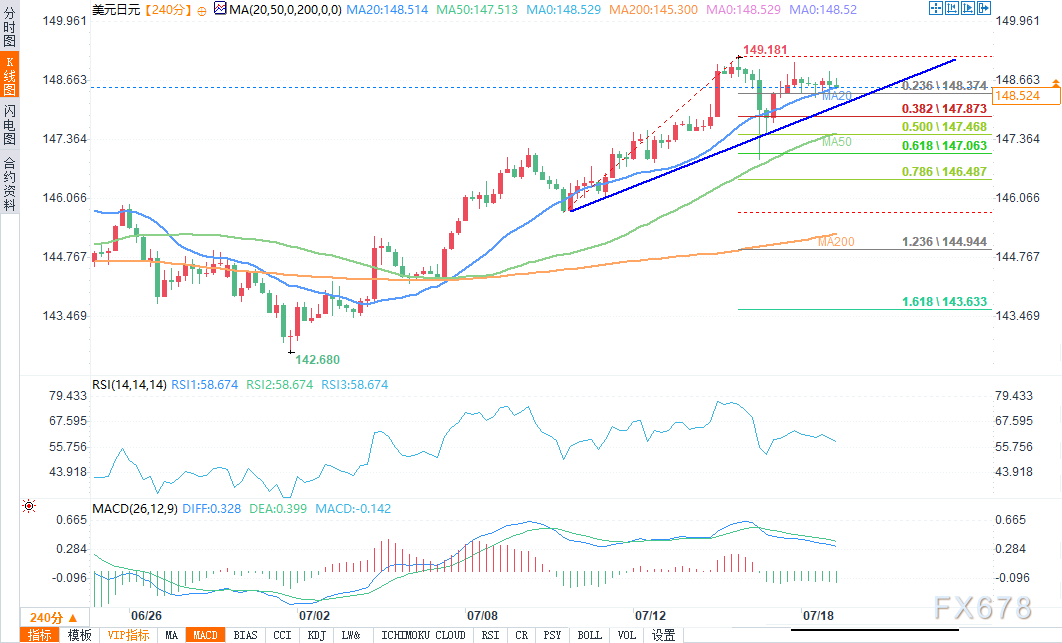 北京时间19:14,美元/日元报148.511/18,跌幅0.06%。