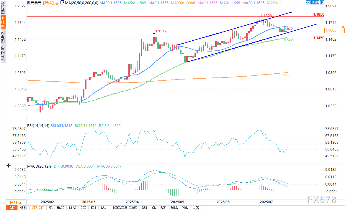 小时图上,欧元/美元呈现盘整迹象,交投于1.1550-1.1720区间,1.16附近形成短期支撑。两周期限期权隐含波动率显示,市场对8月1日美国关税截止日期的担忧加剧谨慎情绪。