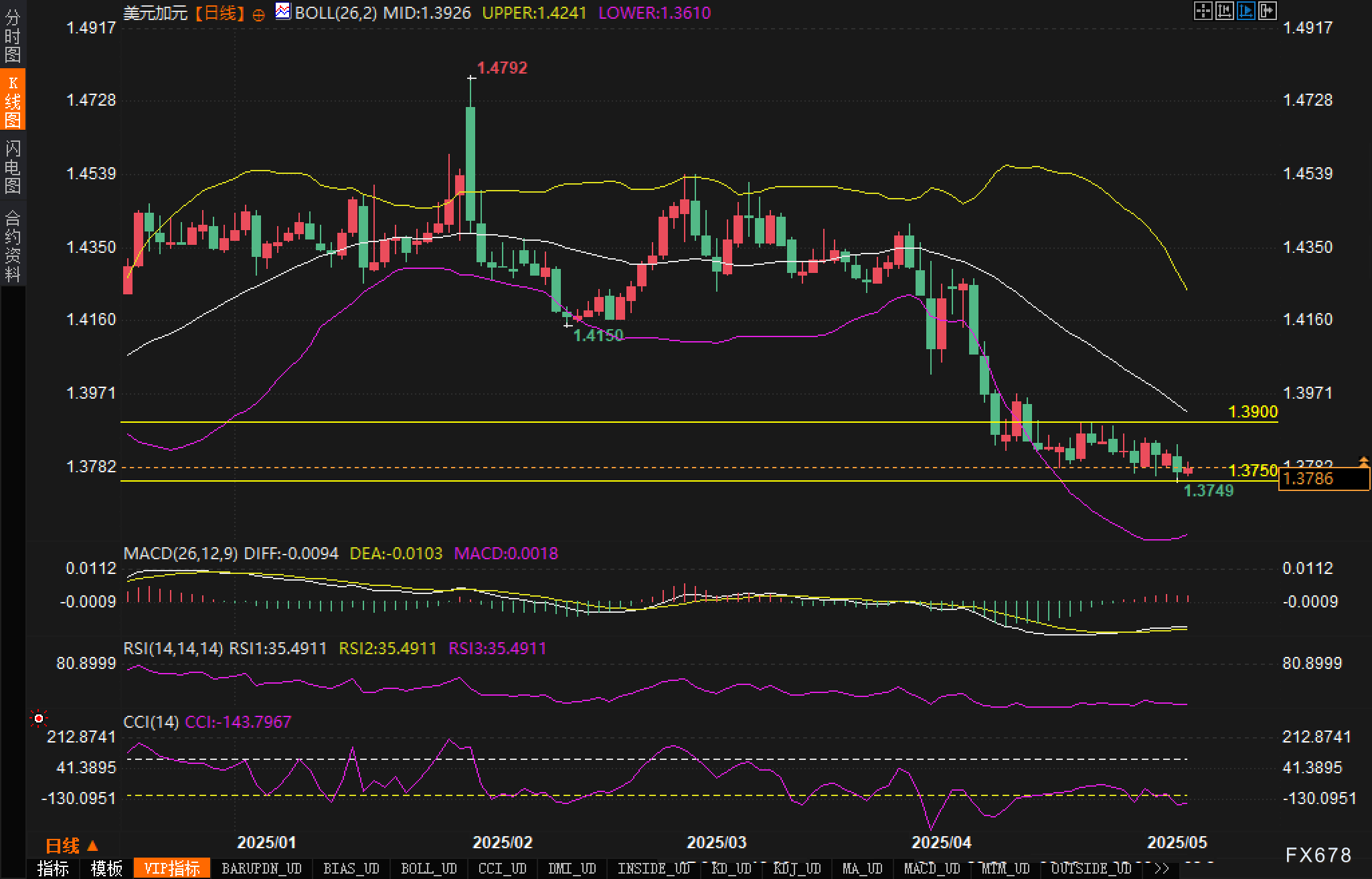 基本面分析 美元/加元目前处于关键节点,美联储利率决议将成为近期市场焦点。交易员普遍预期美联储将在本次会议维持利率不变,但市场更关注鲍威尔在记者会上的表态,尤其是针对关税不确定性和来自特朗普要求降息的政治压力的回应。 另一方面,加元近期表现出一定韧性,这主要归因于加拿大总理马克·卡尼与美国总统唐纳德·特朗普举行的联合新闻发布会后风险情绪有所改善。卡尼随后单独举行简报会,澄清了美加初步贸易讨论的基调。 卡尼表示:"谈判具有建设性。特朗普和我同意在未来几周内恢复讨论,并在G7峰会上进行后续会晤。尽管今天没有就关税作出决定,但双方都致力于推进对话。" 然而,加拿大国内数据对加元构成压力。4月份加拿大经季节调整的Ivey采购经理人指数大幅低于预期,从预测的51.2降至48.0,这表明商业情绪正在恶化。 技术面分析师解读: 美元/加元日线图展现出明显的下行趋势,连续跌破多个关键技术指标。价格自1.4792的高点开始大幅下挫,目前已下跌约1000点,显示出强劲空头势能。