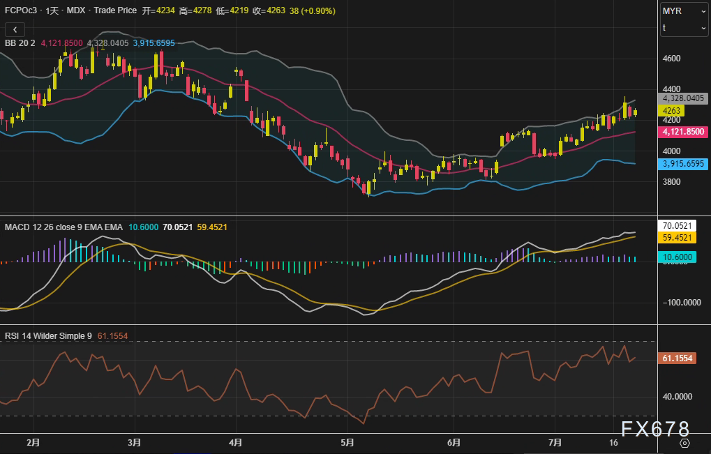 exness外汇官网——周二(7月22日),马来西亚衍生品交易所(BMD)棕榈油主力合约FCPOc3结束日内波动,最终收于4263林吉特/吨,较前一交易日上涨38林吉特(0.9%),收复周一2.1%的部分跌幅。技术指标显示,当前价格位于布林通道中轨(4121林吉特)与上轨(4328林吉特)之间,MACD柱状线收窄至10.6,RSI(14)报61.16,市场短期呈现偏强震荡格局。