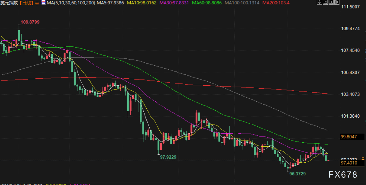 衡量美元兑一篮子货币价值的美元指数下滑 0.3%,至97.545 ,周一下跌约 0.6%。该指数在盘初触及两周低点。
