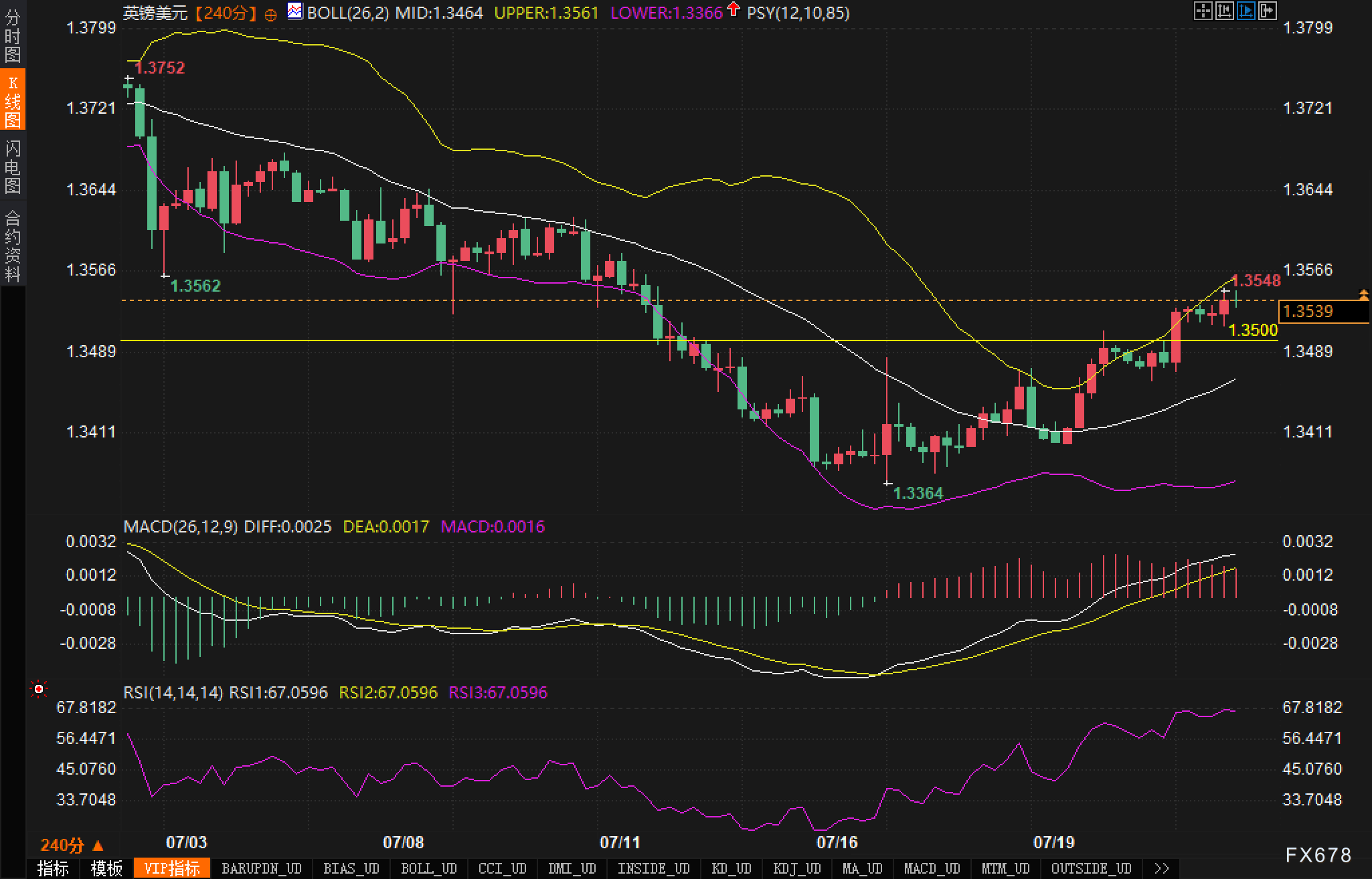 分析认为短期支撑关注1.3500与布林中轨1.3464,若失守则可能回测1.3400区域;上方阻力关注1.3548与布林上轨1.3561,若突破将有望挑战前高1.3752。