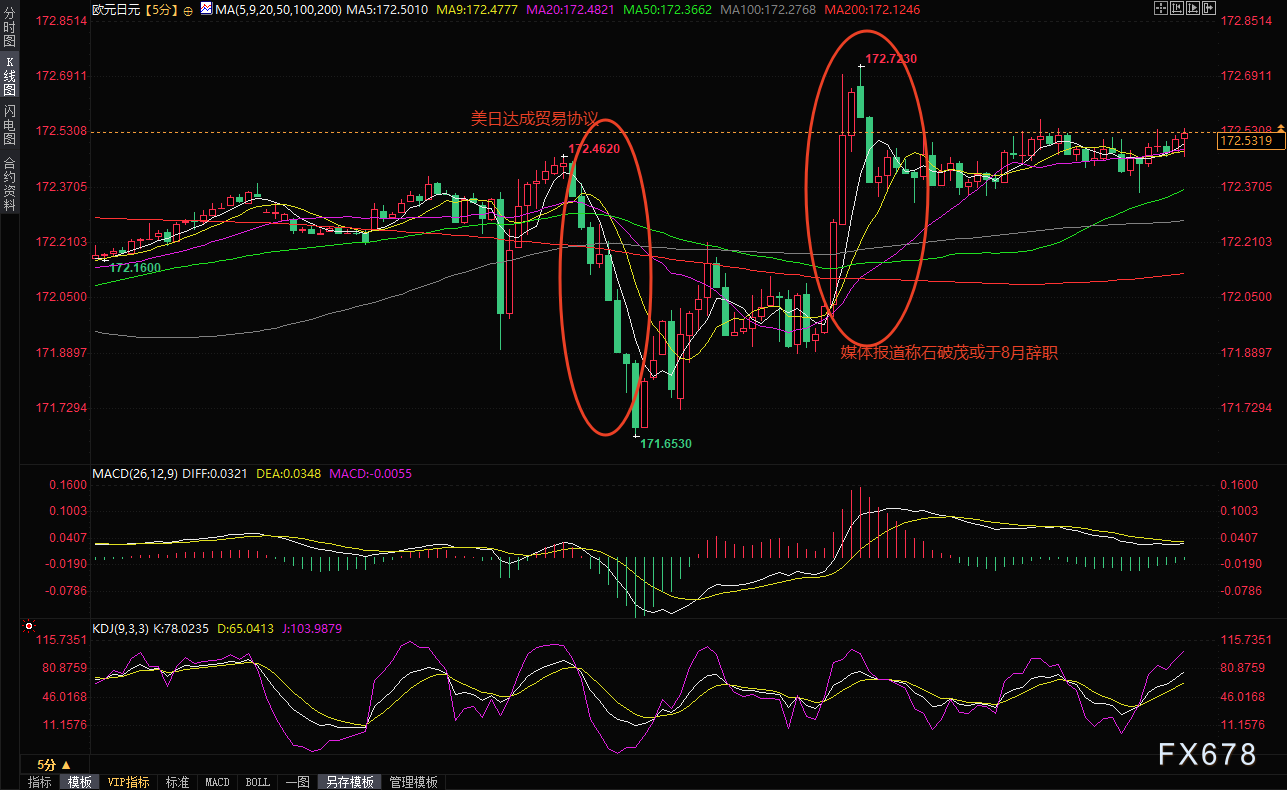 当地时间周二晚上,北京时间周三(7月23日)上午,美日贸易协议达成,欧元对日元的经过了一波过山车走势后交易陷入窄幅波动,主要是受日本关税协议签署消息打压后又受日本政党不稳定提振。之后美国与其主要贸易伙伴之间的贸易紧张局势也成为核心关注点。随着欧盟与美国、美国与日本的贸易谈判完成,截至发稿时,欧元兑日元汇率在172.50附近徘徊,盘中早些汇价曾下跌0.39%至171.65,但受石破茂或将于8月底宣布辞职的消息影响,汇价很快收复跌幅,短线曾经一度拉伸60个点至172.73。