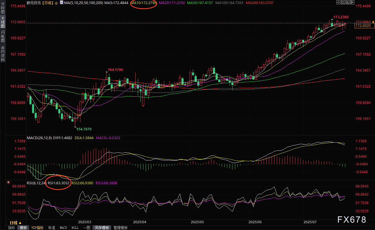exness外汇官网——周三(7月23日)亚洲时段,欧元兑日元于172.40附近窄幅盘整,美日周二达成贸易协议,但欧美谈判仍处僵持(美威胁对欧盟加征30%关税,8月1日生效)。欧洲央行利率决议临近,若释放鹰派信号或影响利差;日本央行鸽派立场延续,德日利差支撑欧元。技术面关注10日均线172.27均线支撑。