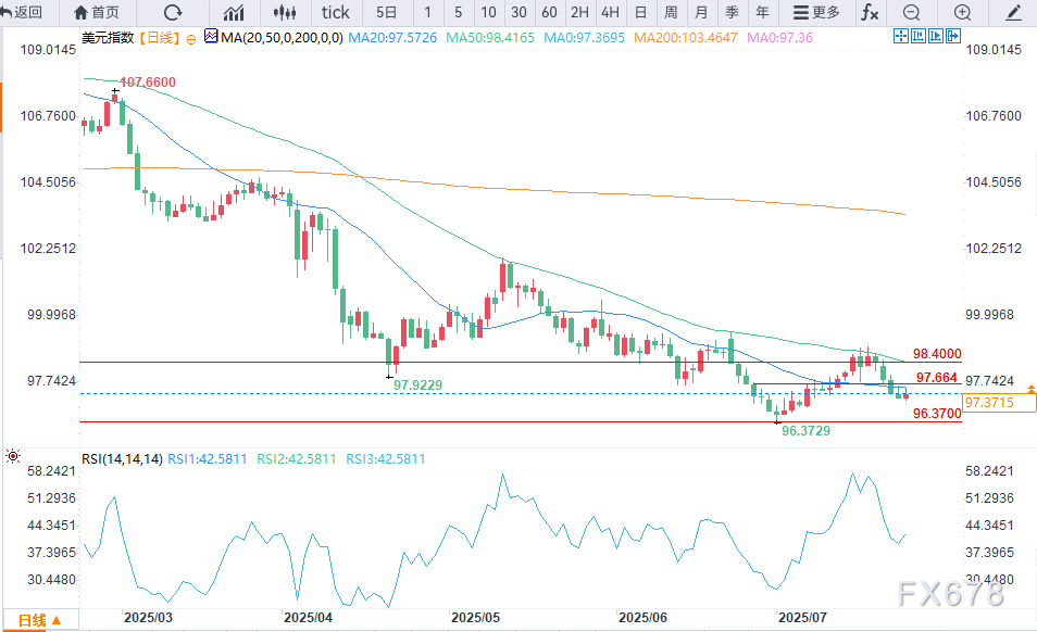 交易员应关注价格能否在7月低点96.377上方形成明确底部,这将表明买方开始入场。否则,美元指数仍易受更深幅回调的影响,近期反弹可能只是更大下行趋势中的短暂停顿。能否决定性收于98.400上方,仍是美元持续上行的关键触发因素。