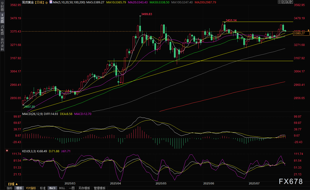 exness外汇官网——周四(7月24日)亚洲时段,现货黄金延续隔夜跌势,目前交投于3380美元/盎司附近,跌幅约0.2%。周三金价收跌1.3%,交易员认为由于贸易乐观情绪改善,打压黄金的避险需求。此外,美元指数对黄金影响受到限制,美债收益率上涨压制黄金。