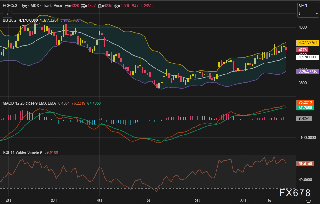 exness外汇官网——周五(7月25日),马来西亚衍生品交易所(BMD)基准10月棕榈油合约(FCPOc3)周五收报4276林吉特/吨,单日跌幅1.25%,周线终结三连涨。技术指标显示,价格仍处于布林通道中轨(4170林吉特)与上轨(4377林吉特)之间,MACD柱状收缩,RSI(14)回落至59.6,短期动能有所减弱。