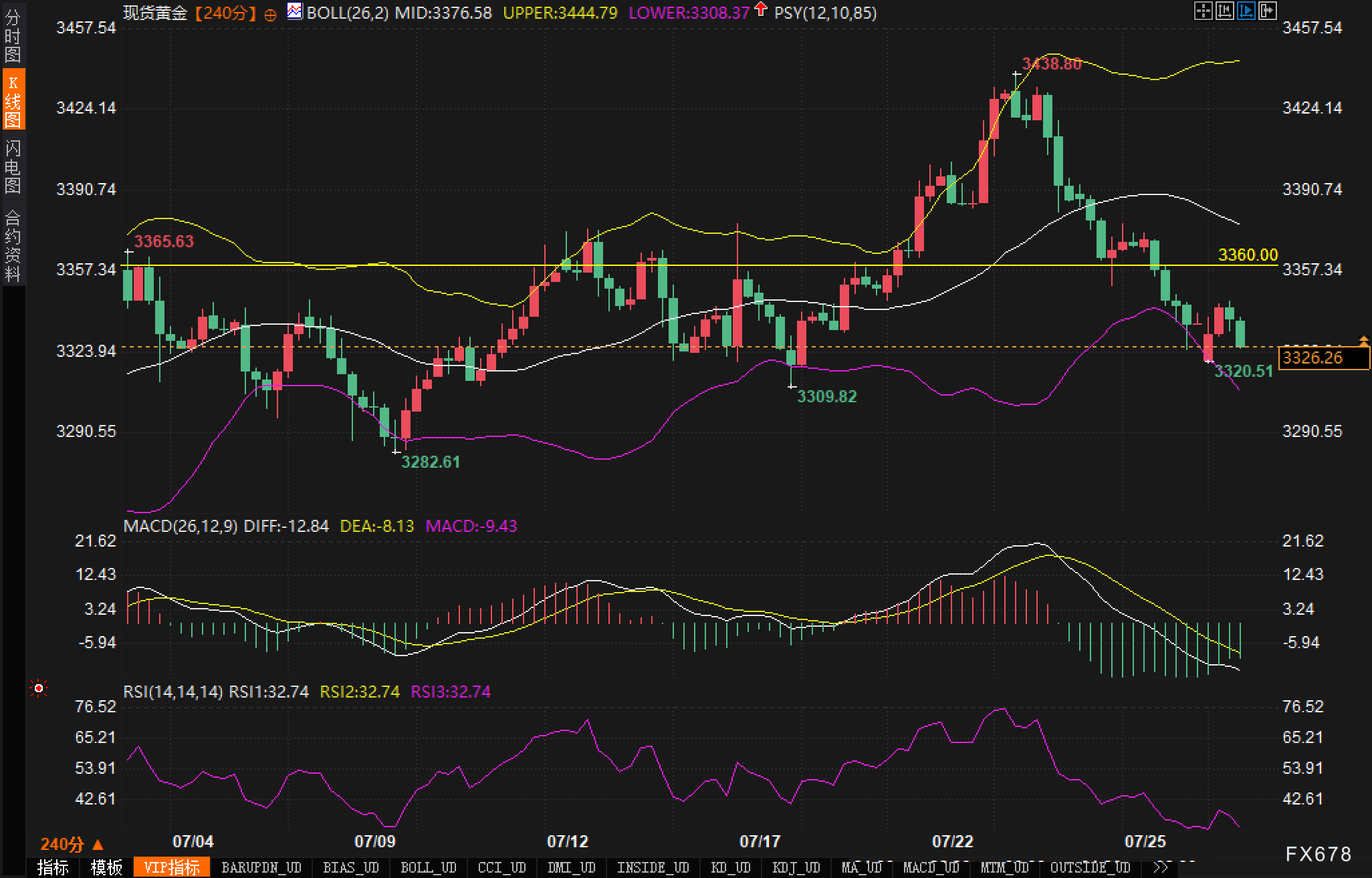 从4小时K线图来看,当前黄金价格运行在布林带下轨附近,布林带通道呈现明显开口,显示短线波动率持续扩张。近期金价自3438.80美元高点快速回落,形成一波典型的短期下降趋势结构。