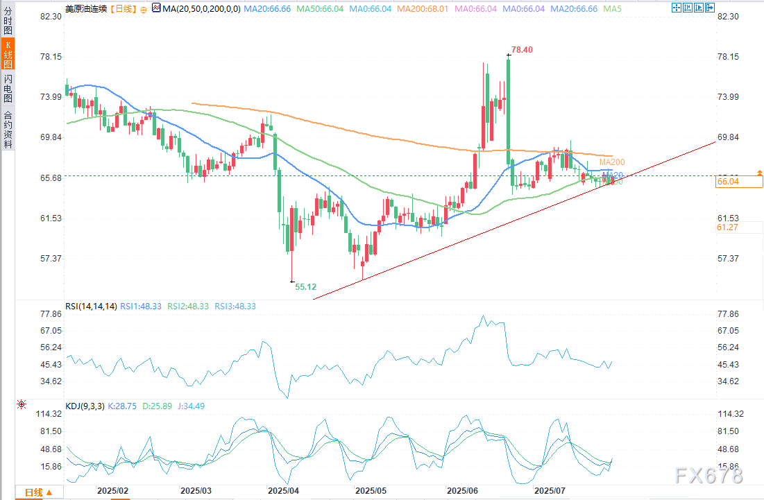 近期油价在65-66美元区间附近盘整,表明市场正寻求方向,但目前支撑位表现稳固。若价格跌破64美元,则可能下探62.69美元。