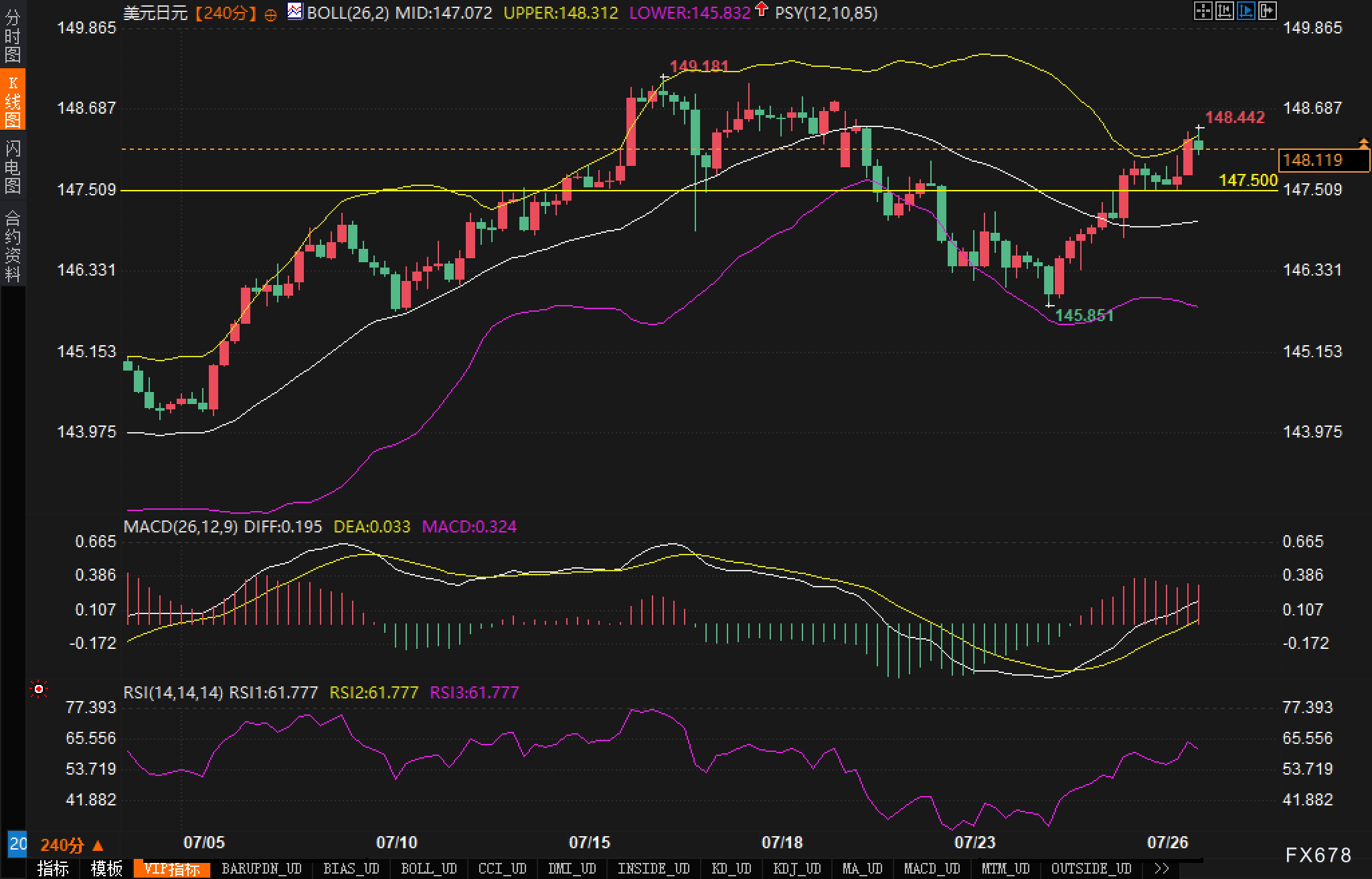 exness外汇官网——周一(7月28日)美市盘前,美元兑日元震荡走高,汇价交投于148.10一线附近,逼近布林带上轨压力位,技术面呈现阶段性反弹格局。