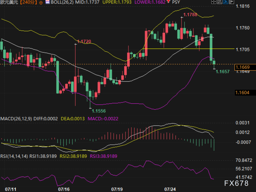 exness外汇官网——周一(7月28日),欧元兑美元汇价短暂上冲至1.1750上方,随后急剧回落,最低触及1.1657水平,日内振幅显著扩大。欧盟与美国之间达成了新的贸易协议,并宣布对欧产品征收统一15%的关税,并伴随欧方对美高额投资承诺。同时,美元则因耐用品订单及劳动力数据表现优于预期,获得持续支撑,进一步压制欧元反弹空间。