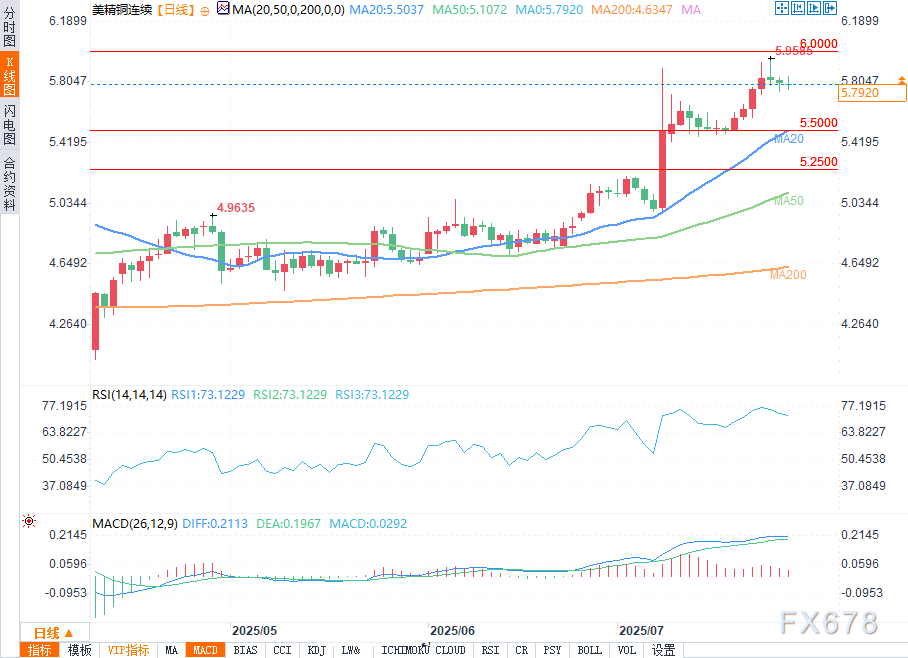 市场仍处于持续上行的挤压态势中。值得注意的是,当前市场已经处于明显的超买状态。短期内可能会出现回调。铜价回落至5.50美元将是一个极具吸引力的买入点位。