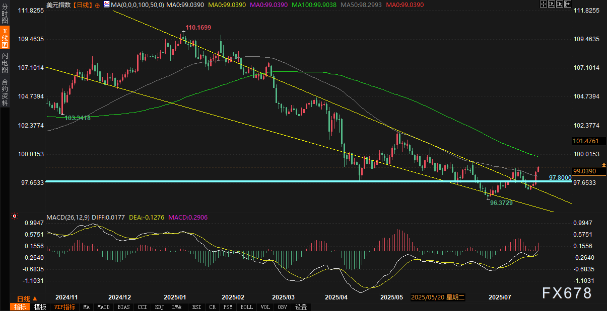 exness外汇官网——周二(7月29日),美元指数(DXY)延续近期强劲涨势,最新报价徘徊在98.89附近,巩固了周一1%的单日涨幅——这是自5月以来最强的单日表现。受美欧贸易协议框架达成以及市场对美国经济数据和美联储政策的乐观预期推动,美元指数7月以来已累计上涨超2%,有望录得自去年12月以来首次月度上涨。尽管日内稍有回落,美元指数仍守住关键支撑位,市场情绪在贸易乐观情绪和经济数据预期中保持谨慎乐观。本文将从基本面和技术面角度深入分析美元指数的最新动态,并结合市场情绪和关键数据展望未来走势。