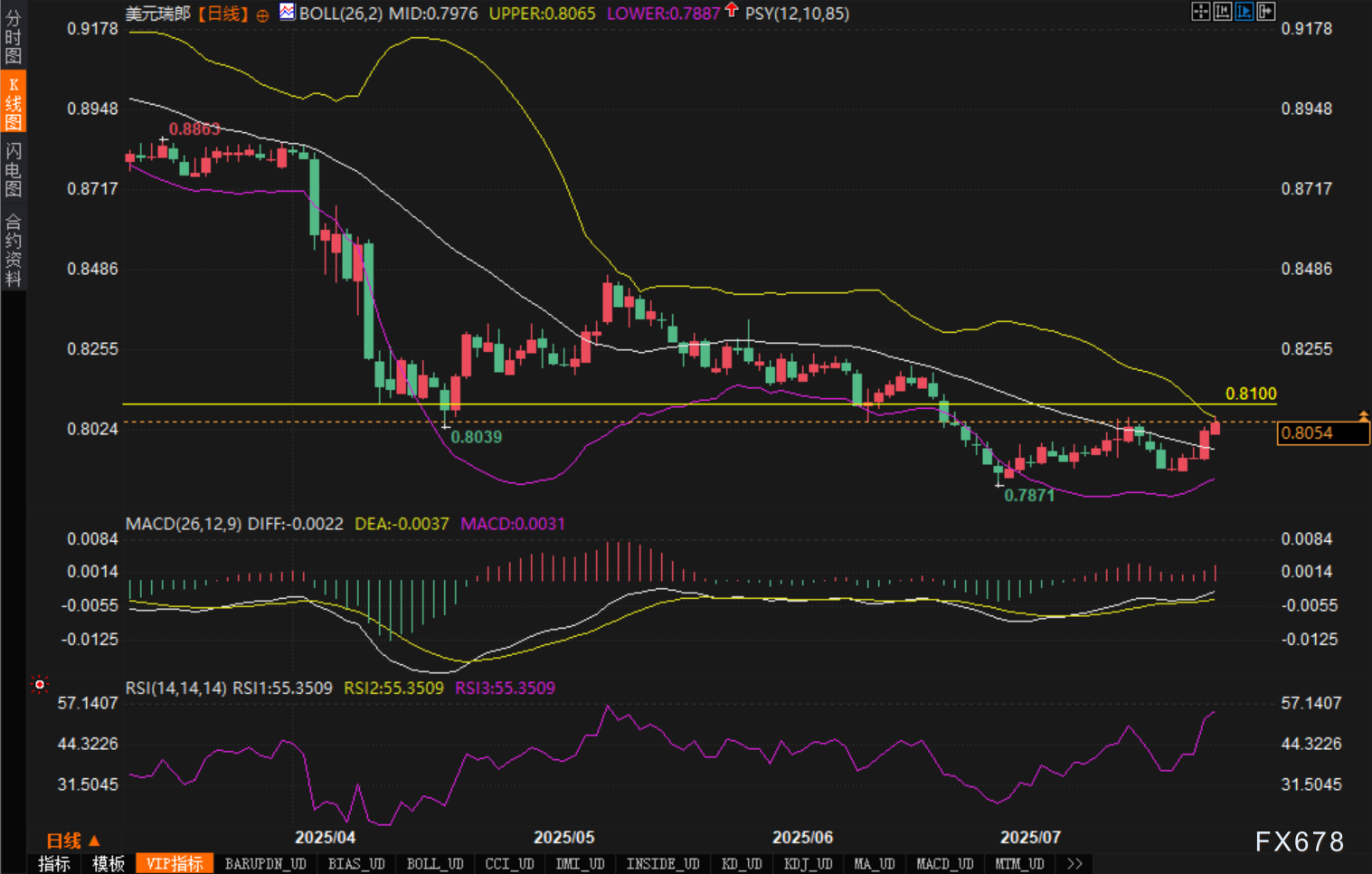 从日线图观察,USD/CHF自0.7871低点企稳反弹,当前交投于0.8050附近,位于布林带中轨0.7976上方。布林带上轨位于0.8065,下轨在0.7887,整体带宽收窄,显示波动率有所减弱,市场处于蓄势阶段。