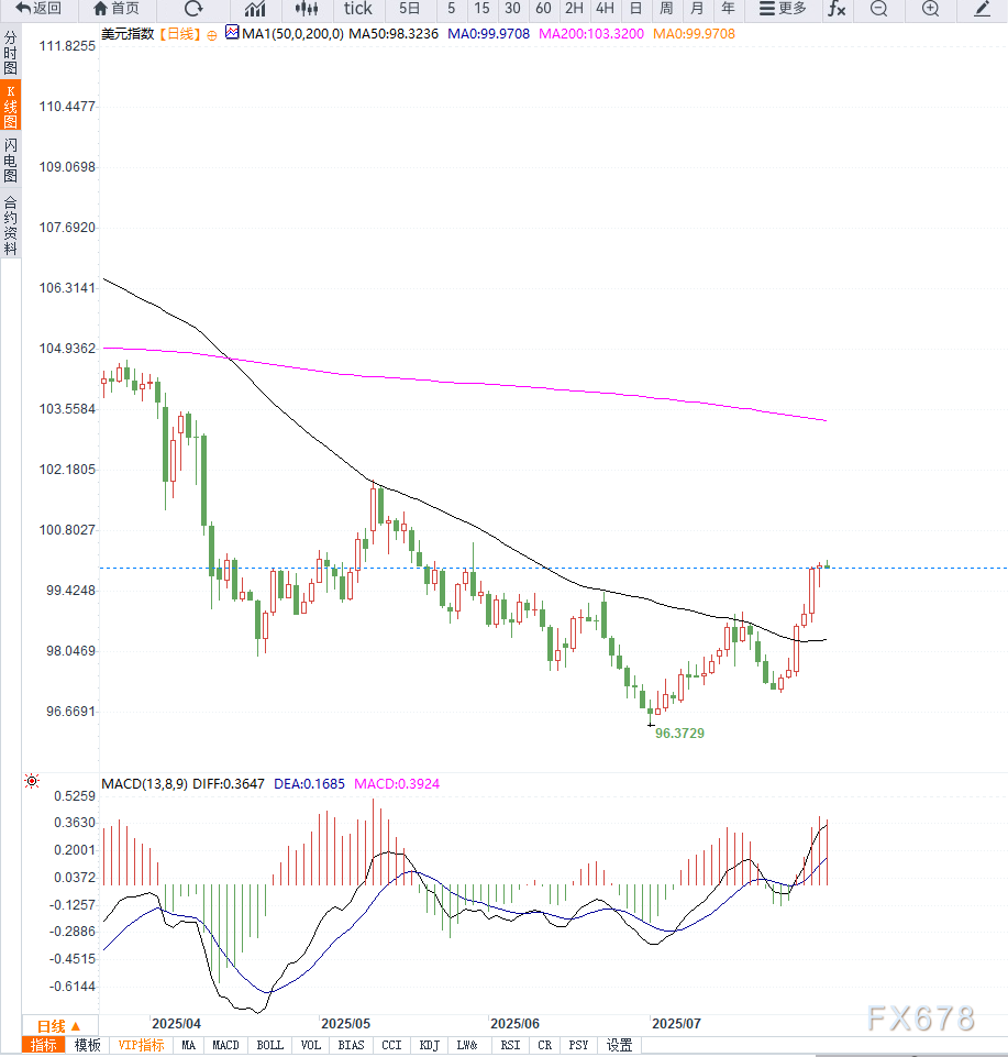 美元指数日线图显示,价格成功站稳在99.40的关键支撑位上方,并持续运行于短期与中期均线上方,技术结构偏多。当前MACD正处于多头放量阶段,RSI指标攀升至64附近,尚未进入超买区间,显示上涨仍有动能。