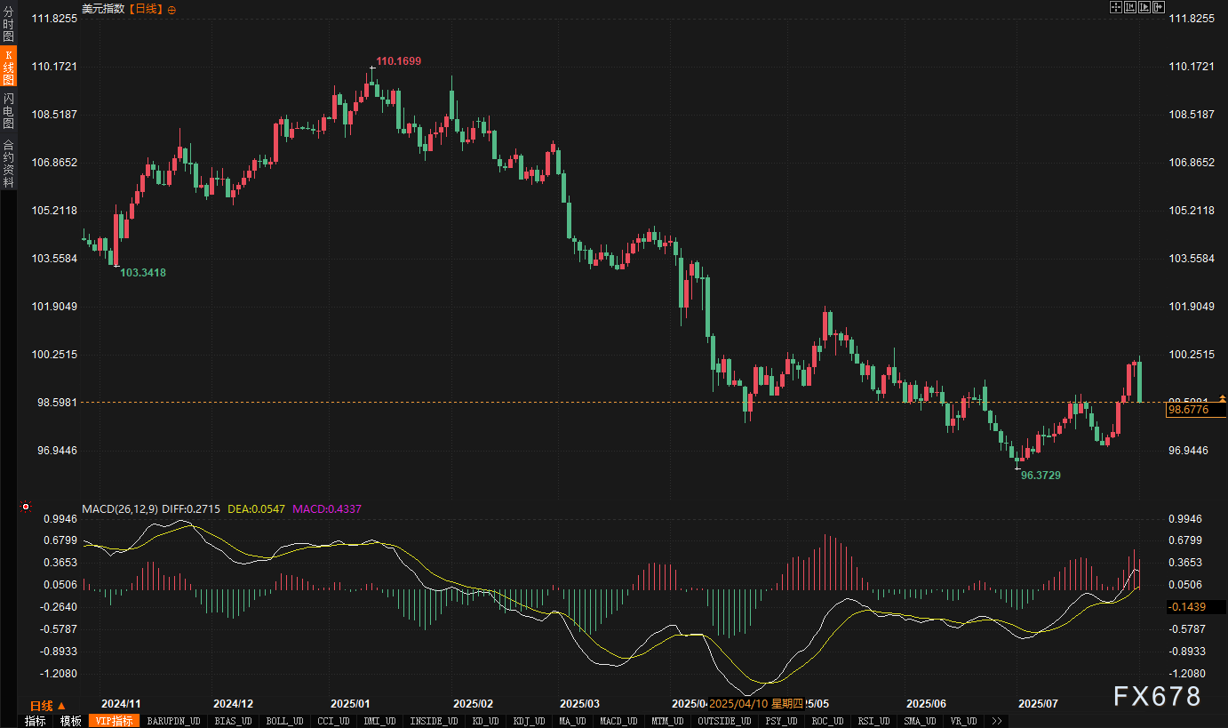 美元指数(=USD)本周初因美国二季度GDP增长3%超出预期而短暂走强,但周三美联储维持利率不变,鲍威尔对9月降息的谨慎表态一度打压降息预期,美元维持高位震荡。周五,7月非农就业数据意外爆冷,仅新增7.3万个就业岗位,远低于市场预期的11万,且6月数据大幅下修至1.4万,美元指数应声下跌1.06%,收报98.97,创近四个月最大单日跌幅。