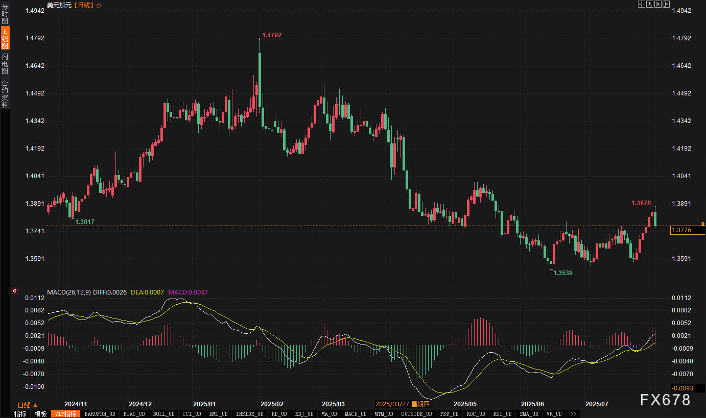 加元兑美元(CAD=)周初因特朗普对加拿大加征35%关税(高于此前威胁的25%)而短暂走弱,最低触及1.3879,创5月22日以来最弱水平。周五非农数据公布后,美元下跌,加元反弹0.44%,收报1.38。油价上涨为加元提供部分支撑。