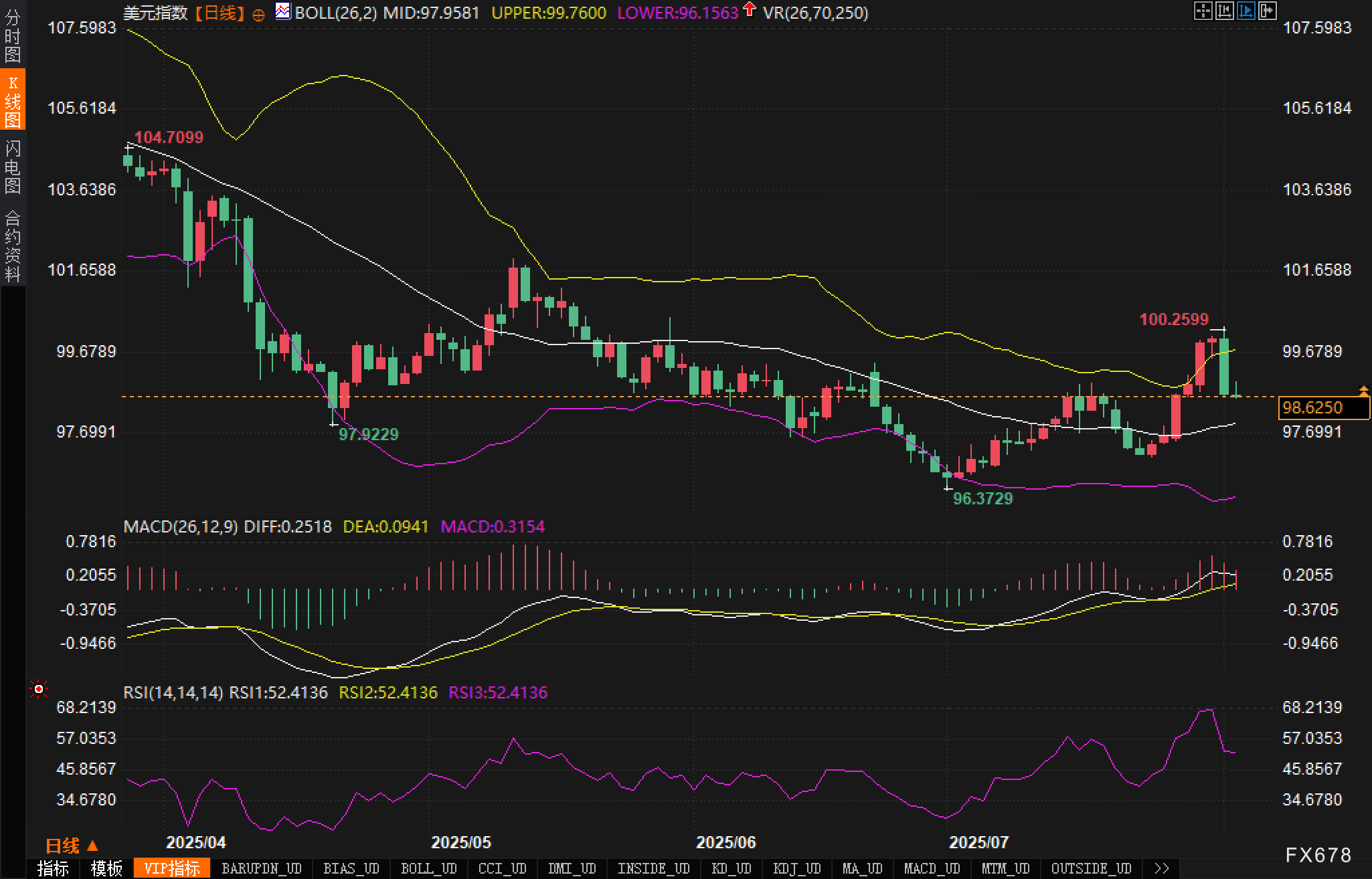 美元指数日线图显示,自低点96.3729以来的反弹在近期冲击至100.2599后受阻,形成假突破信号。当前布林带呈“开口转收缩”态势,反映波动率进入压缩阶段,短期或将酝酿新一轮趋势启动。