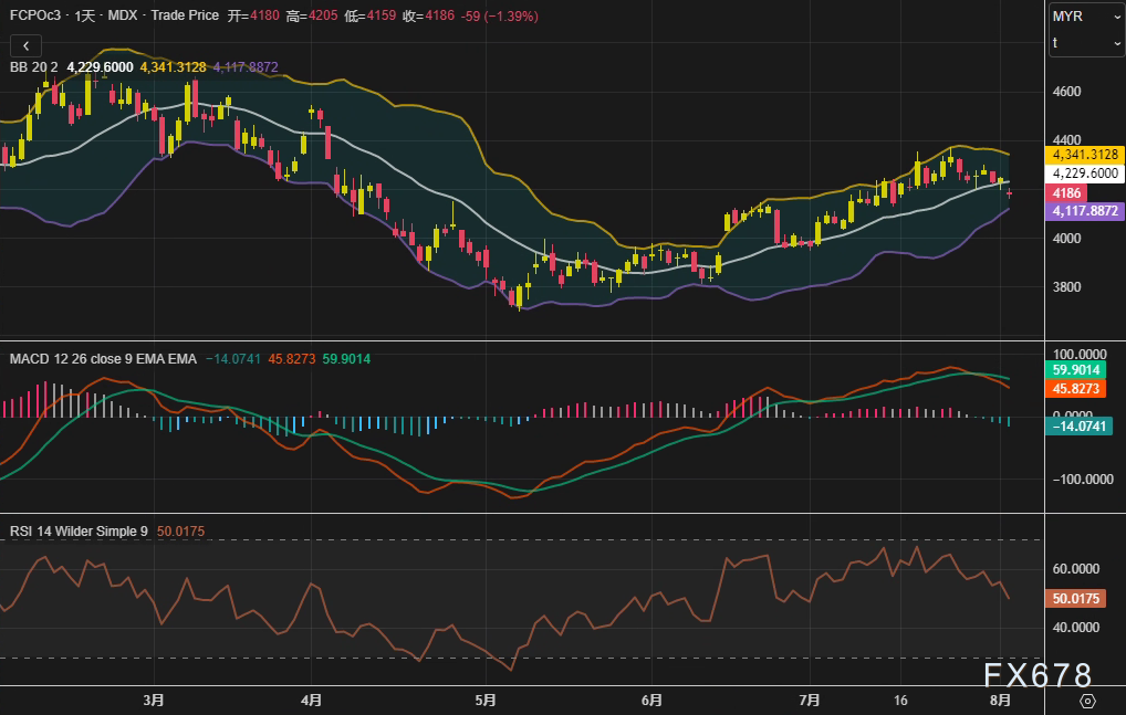 exness外汇官网——周一(8月4日),马来西亚衍生品交易所(BMD)棕榈油主力合约FCPOc3收跌1.39%,报4186林吉特/吨,盘中技术指标呈现多空交织态势:布林带(20,2)中轨位于4341林吉特,而RSI(14)暂稳于50.01中性区间。市场情绪明显受到基本面利空主导,尤其是库存持续累积与产量回升的预期,叠加外围油脂市场疲软,共同压制价格表现。