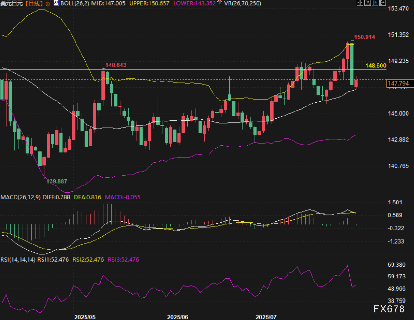 考虑到美元兑日元上攻至150.914后未能形成有效突破,结合技术面指标转弱以及布林带回压,分析认为短线行情大概率进入宽幅震荡阶段;下方关键支撑位于布林中轨147.005附近,一旦跌破,或进一步测试145.000区域;上方压力位则位于148.600与前高150.914两大水平,若后续反弹遇阻,需防范结构性调整。