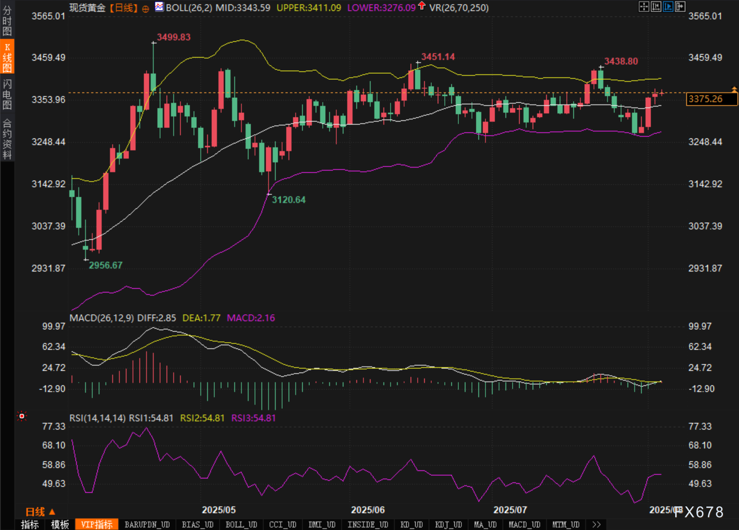 从黄金日线图来看,价格近日运行于布林带中轨(3343.59)和上轨(3411.09)之间,仍未有效突破关键阻力区域。整体走势维持在中期震荡通道之内,未形成明显趋势方向。