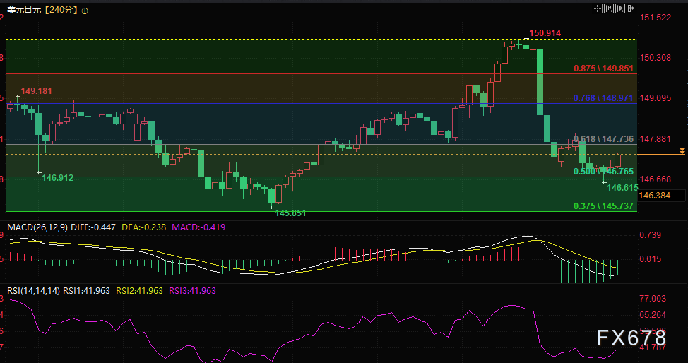 美元价格在7月低点算起反弹的50%分位处上方运行,盘中回测了50%分位线显示出韧性,随后回到147.00上方,表明此处美元多头驻守,空头做空须当心。