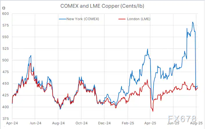 本月初,支撑白银和铂金走势的还有纽约高等级铜价的飙升,7月8日铜价触及每磅5.8955美元的纪录高位。此前,特朗普总统出人意料地提议对铜进口征收50%的关税,这一比例是市场预期的两倍。这番言论导致纽约铜价相对伦敦金属交易所(LME)铜价的溢价达到创纪录的34%,引发了在截止日期前向美国运送铜的热潮。
