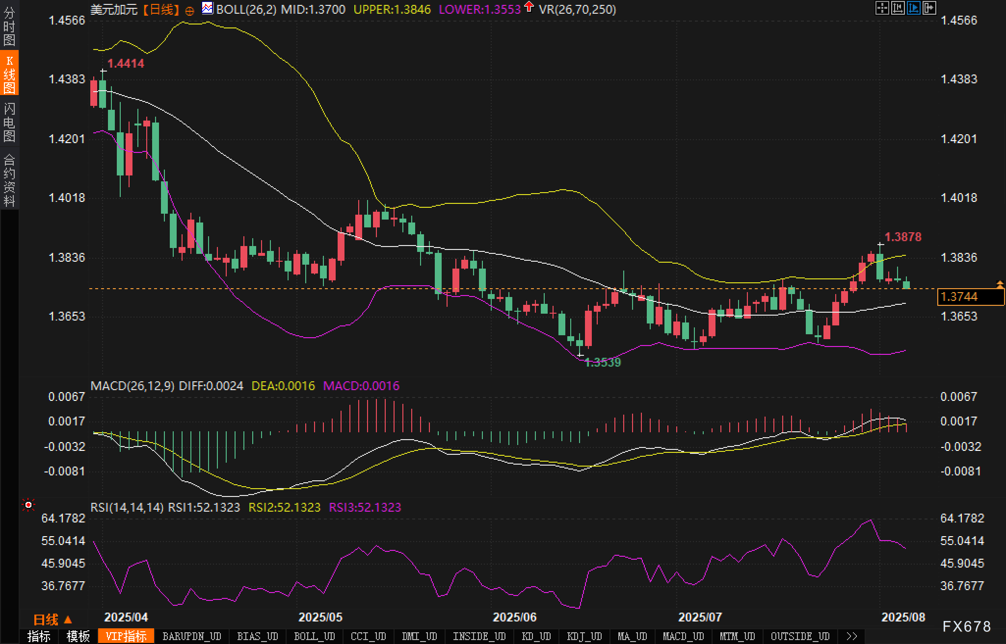 当前日线图显示,美元/加元自1.3878高点回调后,多头动能放缓,汇价正测试布林带中轨1.3700一线支撑。整体布林带结构维持上轨发散、下轨企稳形态,表明波动率有所扩大但短线进入整理阶段。