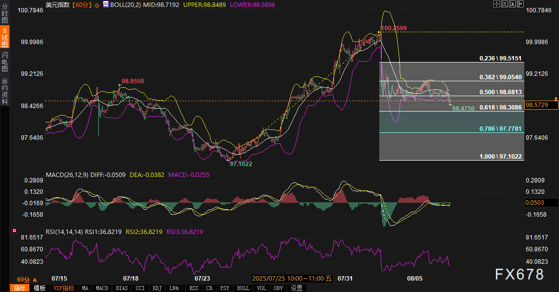 若美元指数在97.7781(78.6%回撤位)附近获得支撑,可能触发技术性反弹,目标指向98.00的心理关口,甚至进一步回抽至61.8%回撤位(98.3086)。从指标上看,若RSI从超卖区域回升至40上方,且MACD形成金叉,将为反弹动能提供进一步确认。这一情景可能受到市场情绪短期改善或美联储官员鸽派言论的缓和推动。