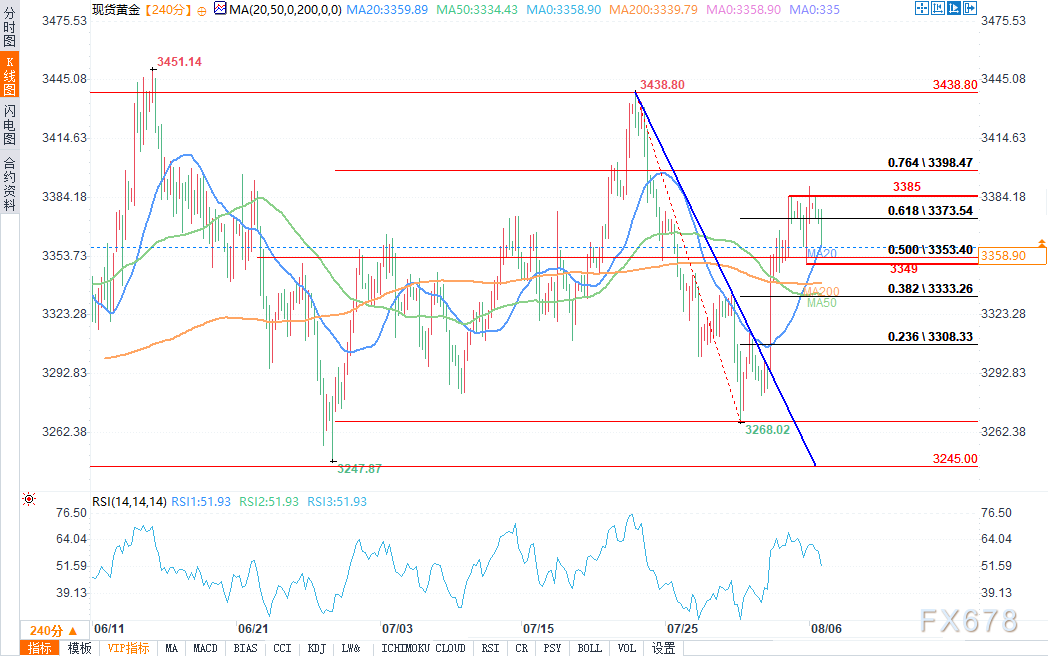 从4小时图中能够发现,金价在3349美元至3385美元区间内出现了一定程度的盘整。买方希望看到金价向上突破,以将涨势延伸至关键阻力位;而卖方则期待金价向下突破,进而加仓做空,目标是回调至3245美元支撑位。