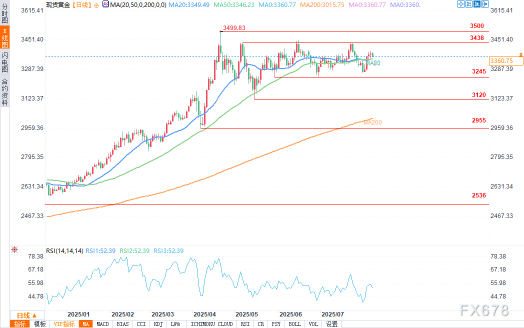 从日线图中可以看到,在非农就业数据引发反弹后,黄金持续小幅走高后小幅回调,下一重要阻力位是3438美元左右水平。若金价触及该水平,预计卖方会再次在阻力位附近介入,他们将3438美元上方设为明确的风险点,伺机做空,目标是回调至3245美元支撑位。另一方面,买方则希望看到金价突破这一阻力位,从而增加看涨押注,冲击新的历史高点。