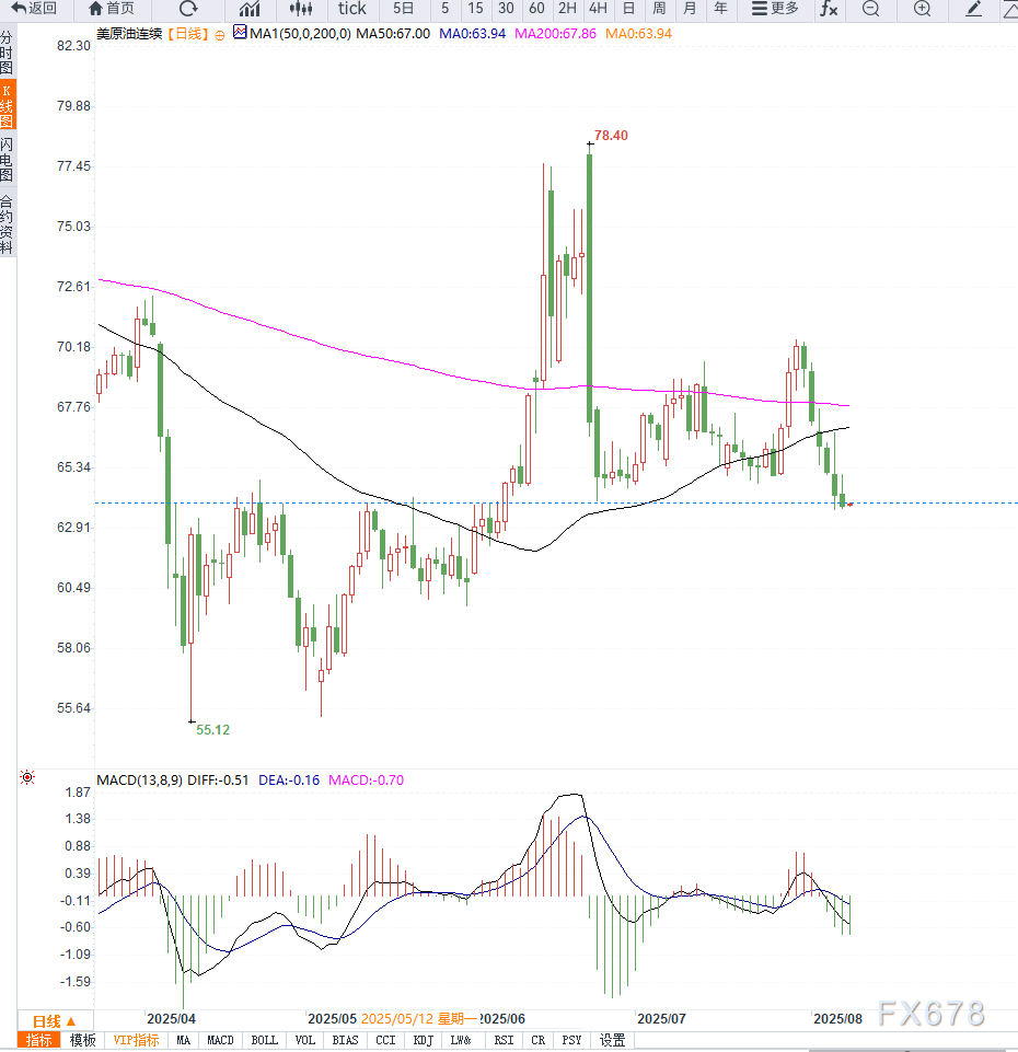 从日线图来看,美国WTI原油价格延续下行通道,连续六个交易日收阴,整体走势疲弱。目前价格已跌破关键支撑位65美元,逼近63美元区间,该区域曾在5月和6月多次形成反弹。