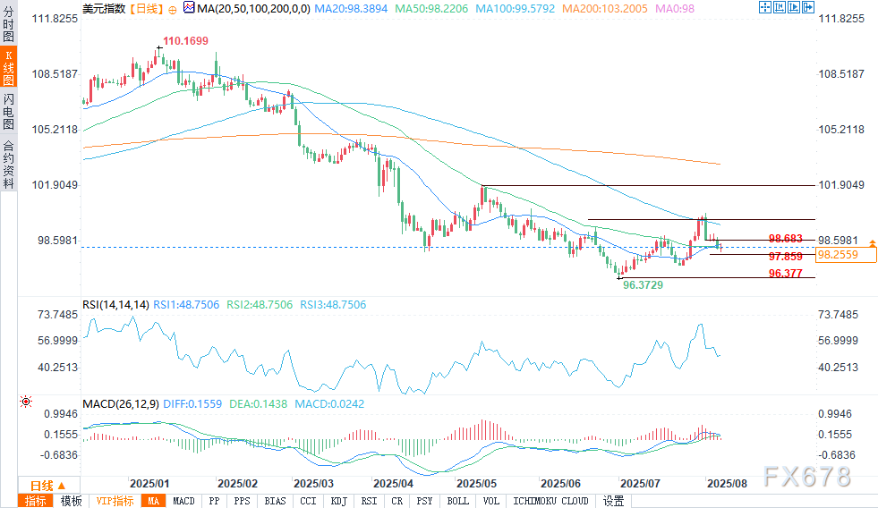 exness外汇官网——周四(8月7日)美盘时段,美元指数小幅走高,扭转早盘跌势。市场正在消化新的地缘政治新闻、海外央行政策变化,以及更多关于美国货币政策治理遭政治干预的迹象。美元曾短暂跌至1.5周低点97.927,盘中回升至98.26,当日上涨0.05%。