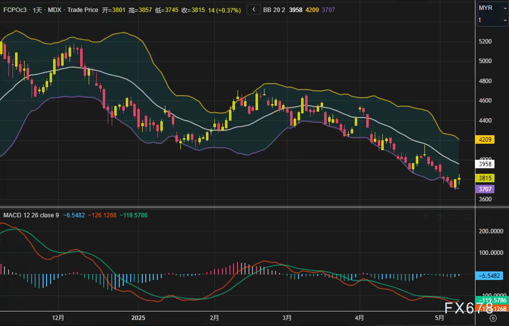 exness——周五(5月9日),马来西亚衍生品交易所(BMD)棕榈油主力合约FCPOc3收报3815林吉特/吨,日内上涨0.37%,但周线仍录得1.7%跌幅,连续第二周收阴。日线级别技术指标显示,布林通道(20,2)中轨位于3958林吉特,MACD柱状图虽收窄至-119.578,但双线仍深陷负值区域,暗示市场尚未摆脱弱势格局。