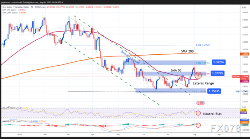 exness外汇官网——周四(8月7日)亚洲时段,美元兑加元微跌0.04%,现交投于1.3733附近,早些时候曾小幅下探至1.3728,为7月29日以来新低。该汇价在7月底曾录得日线六连阳,势头强劲,但本周逆转,连续多日承压。这一走势由美联储变动的利率政策预期与加拿大央行政策分化及美国元指数内涵基本面变化而驱动。
