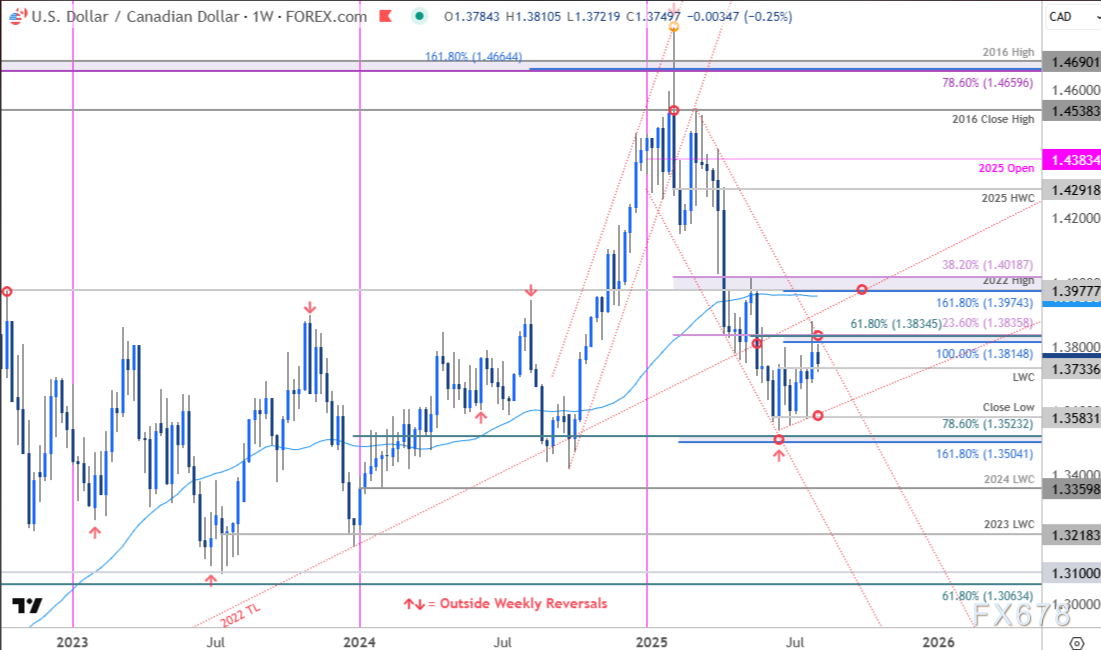 exness外汇官网——周五(8月8日),上周美元兑加元价格对7月形成的箱体结构进行了突破,受到月线级别下行趋势线的压力,价格突破后快速回落。周线级别,美元兑加元上周短暂突破了多周形成的箱体,但未能突破2025年的下行趋势。价格随后回调,八月开盘区间目前正在这一关键斜线下方形成。焦点在于此次回落是行情反转,后续继续下跌,还是仅仅是测试突破的阻力位。美元加元周线技术图表上的多空区域已经划定,即将迎来加拿大就业数据和美国CPI。