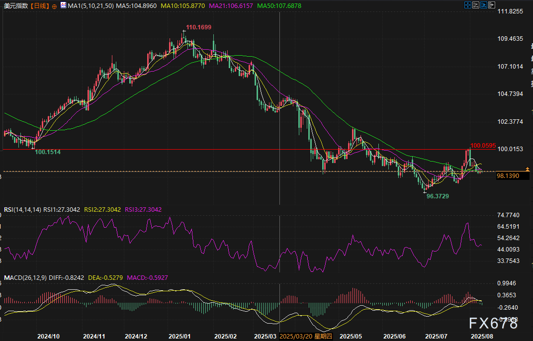 exness外汇官网——周一(8月11日),亚欧时段美元指数微跌0.09%,价格运行在10、20、50日均线下方,中期走势受到压制,目前交投于98.14,处于100整数关口下方。美元指数的波动始终与市场对美元资产吸引力的评估紧密相连,同时美元指数正面临多重来自政策预期和经济数据,以及市场情绪的影响。