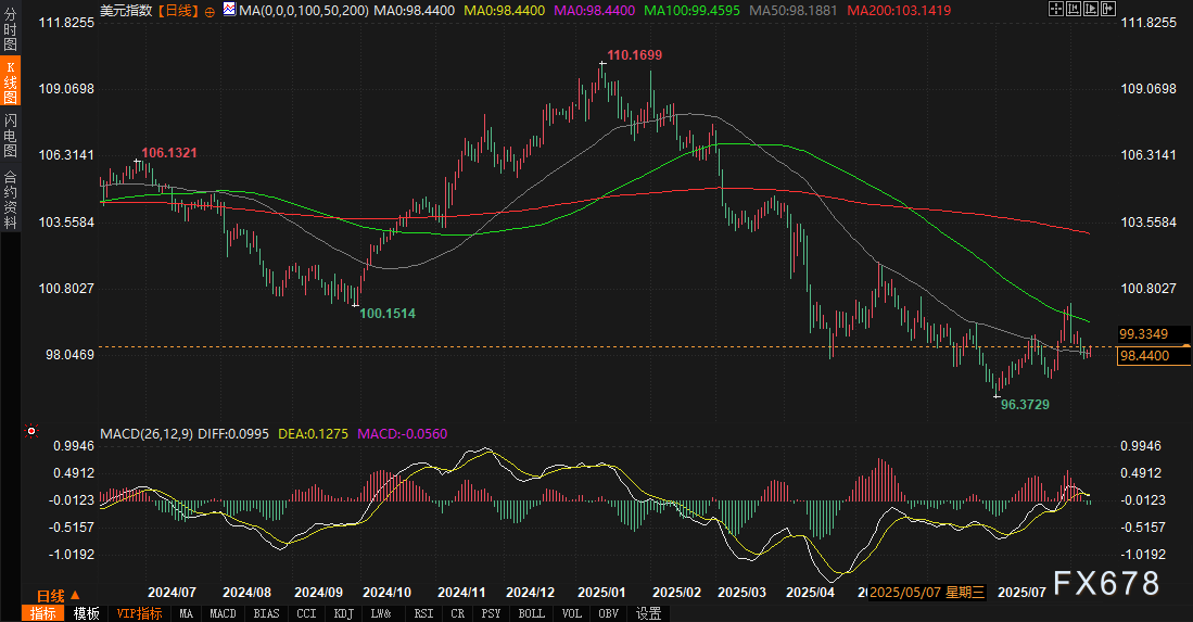 exness外汇官网——周一(8月11日),全球金融市场在关税言论、俄乌局势持续发酵以及美联储货币政策预期调整的背景下,呈现出复杂而微妙的波动。美元指数最新报98.4570,日内小幅上涨0.21%,显示市场在多重风险事件前保持谨慎。美债市场方面,10年期美债收益率最新报4.27%,较前一周略有回落,但长端收益率受关税引发的通胀预期及债务供应压力影响,整体仍维持高位。市场关注焦点集中在即将发布的美国7月CPI数据、俄乌局势相关会谈,以及美联储降息路径的不确定性。本文将结合基本面与技术面,深入分析美债与美元市场的联动性,并展望未来趋势。