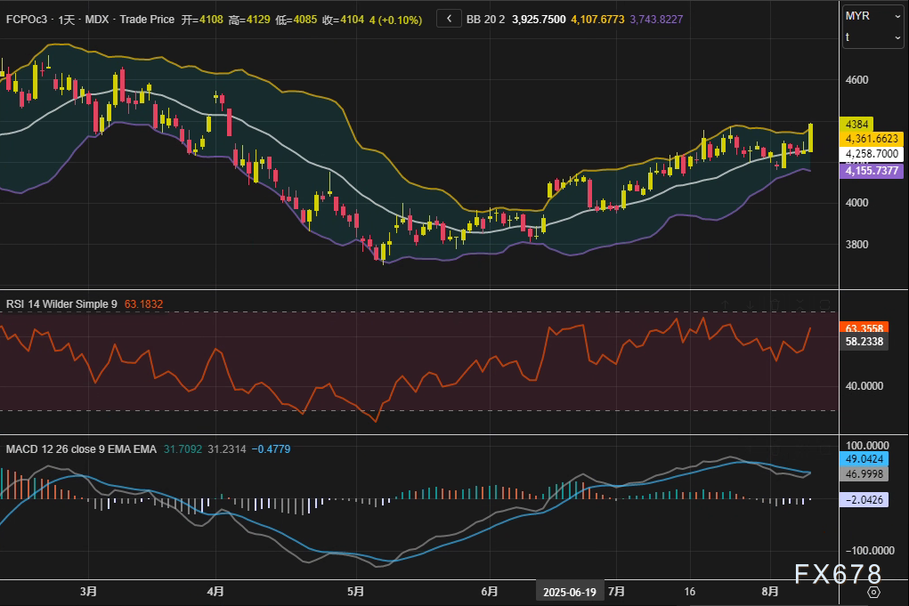 exness外汇官网——周一(8月11日 ),马来西亚衍生品交易所(BMD)棕榈油主力合约今日大幅收涨3.03%,报每吨4384林吉特,创下自4月3日以来的最高收盘价。这一强势表现直接受到马来西亚棕榈油局(MPOB)7月库存数据及船运机构出口预估的提振。技术面上,合约日线MACD金叉初现,RSI站上63.18的中性偏强区间,布林通道上轨被突破至4107林吉特,显示短期动能充沛。