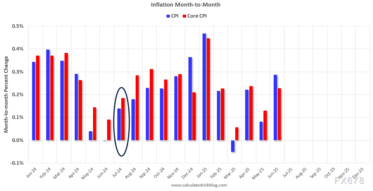 圈出的区域是去年7月的变化。2024年7月CPI上涨0.14%,核心CPI上涨0.19%。因此,任何高于7月份数据的数据都将推高同比通胀。