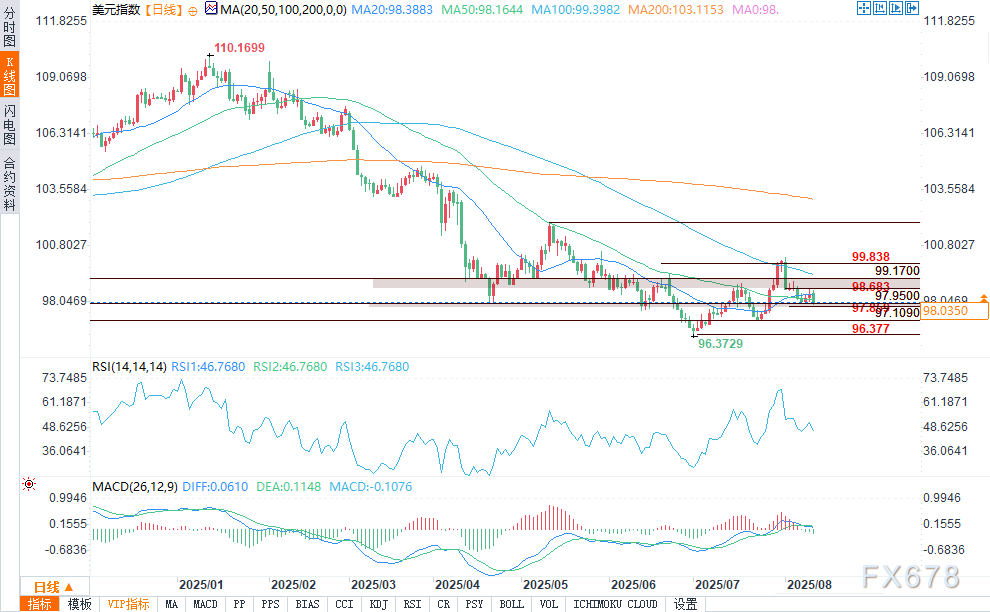 从技术层面来看,美元指数跌破98.200的50日均线后,处于弱势地位,该指标已成为新的阻力位。今日的抛售使得市场有可能突破97.859的斐波那契支撑位,该水平可能成为下行加速的触发点,下一个主要目标是7月24日创下的97.109低点。