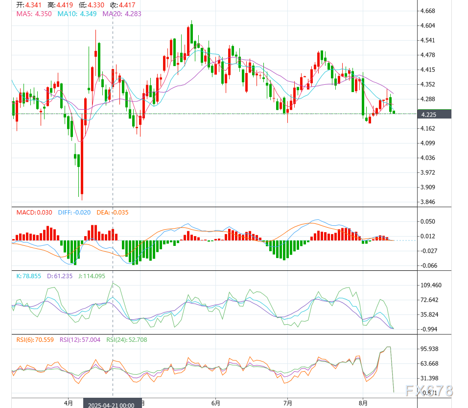 正如相对强弱指数(RSI)所示,势头是看涨的。然而MACD位置偏低,价格继续往上有背离风险,如果出现问题,现货白银跌破38.00美元可能会给多头带来压力,空头可能会挑战最近的周期低点37.50美元,即8月12日的低点。如果跌破这一水平,下一个关注区域将是7月31日的摆动低点36.21美元。