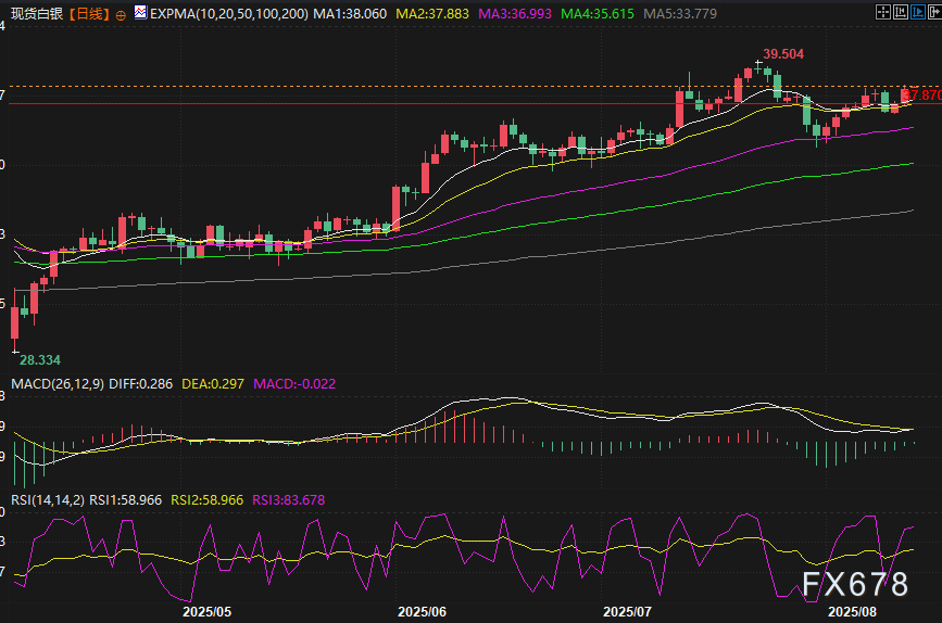 exness外汇官网——周四(8月14日)亚市,现货白银延续周三涨势,现在交投于38.58美元/盎司附近,涨幅约0.28%,逼近隔夜创下的近两周高点;周三现货白银上涨了1.63%,受市场押注美联储降息以及美国10年期国债收益率暴跌提振。