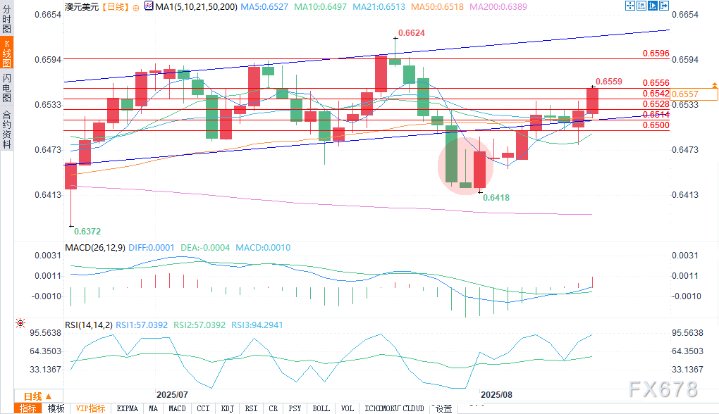 澳元/美元已突破0.6528和0.6542的阻力位,目前正在测试0.6556。上方阻力位在0.6596。下一个支撑位为0.6514和0.6500。