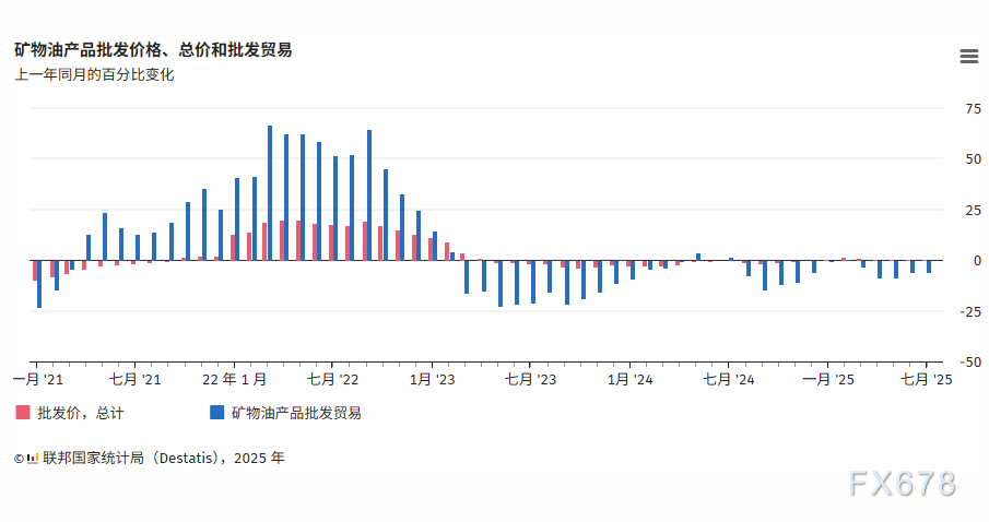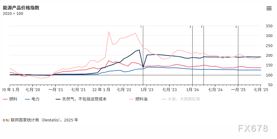 能源产品价格在 2025 年 7 月比去年同月下降 3.4%,看似对经济有积极作用,但实际情况却较为复杂。虽然能源价格跌幅连续第三个月放缓,7 月跌幅有所减弱(2025 年 6 月:-3.5%),汽车燃料(-4.5%)、家用能源(-2.6%)等价格均同比下降,消费者受益于木柴、木屑颗粒和其他固体燃料(-5.3%)、取暖油(-5.0%)、电力(-2.0%)和区域供热(-1.8%)价格的下降,但天然气价格却比一年前略高(+0.3%)。