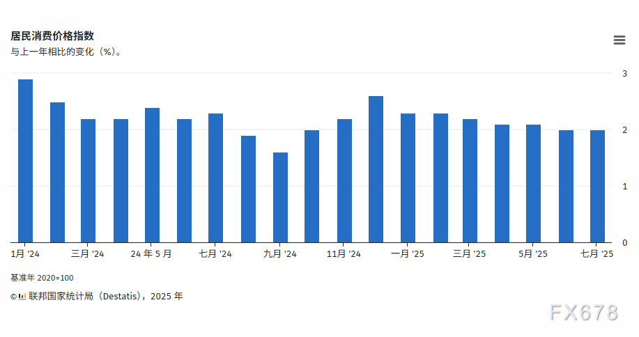 从通货膨胀率来看,2025 年德国通货膨胀率稳定在 + 2.0%,6 月与 7 月数据持平,此前 5 月和 4 月均为 + 2.1%。虽然看似稳定,但深入分析其 CPI 分项数据,却能发现诸多隐忧。