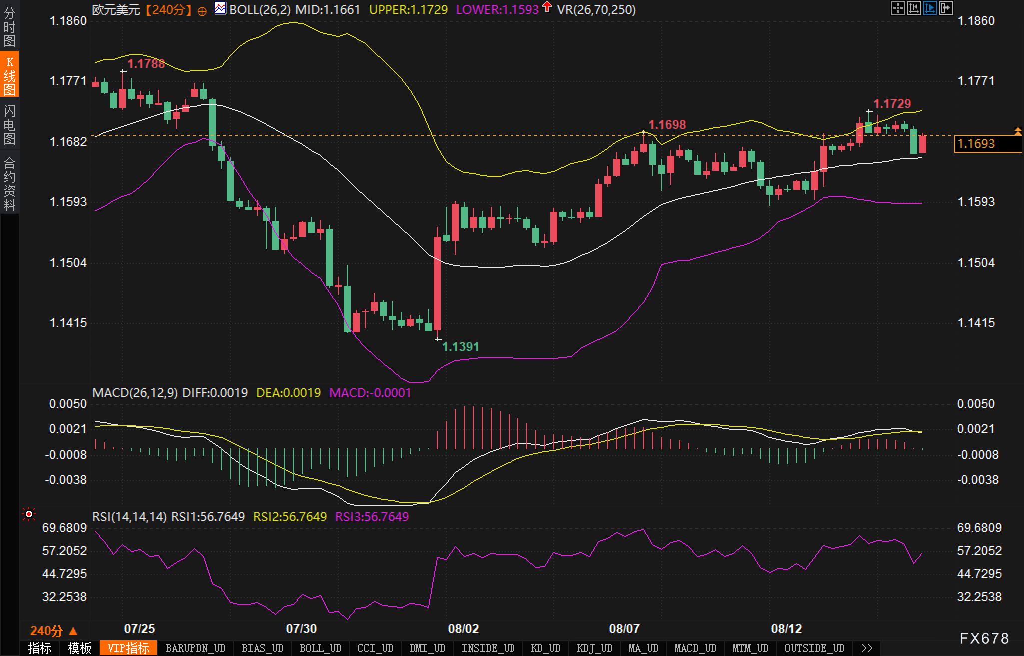 1.1729:布林带上轨,汇价若突破此位,将有可能挑战1.1778的高点。
