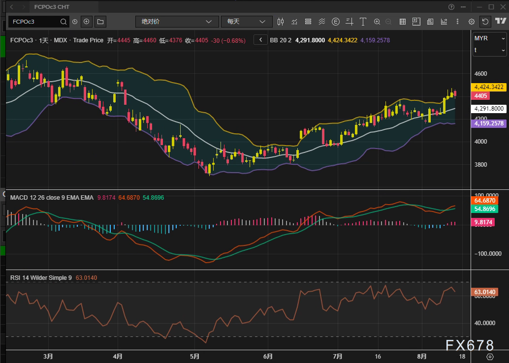 exness外汇官网——周四(8月14日)马来西亚衍生品交易所(BMD)棕榈油主力合约今日结束四连涨,10月合约收报4405林吉特/吨,日内下跌30林吉特(0.68%)。技术面显示,价格仍处于布林通道中轨(4291林吉特)与上轨(4424林吉特)之间,MACD柱状线收窄至54.87,RSI(14)维持在63.01的中性偏强区间,短期多头动能有所减弱。此次回调主要受获利了结及印尼B50政策不确定性扰动,但供需格局尚未出现实质性逆转。